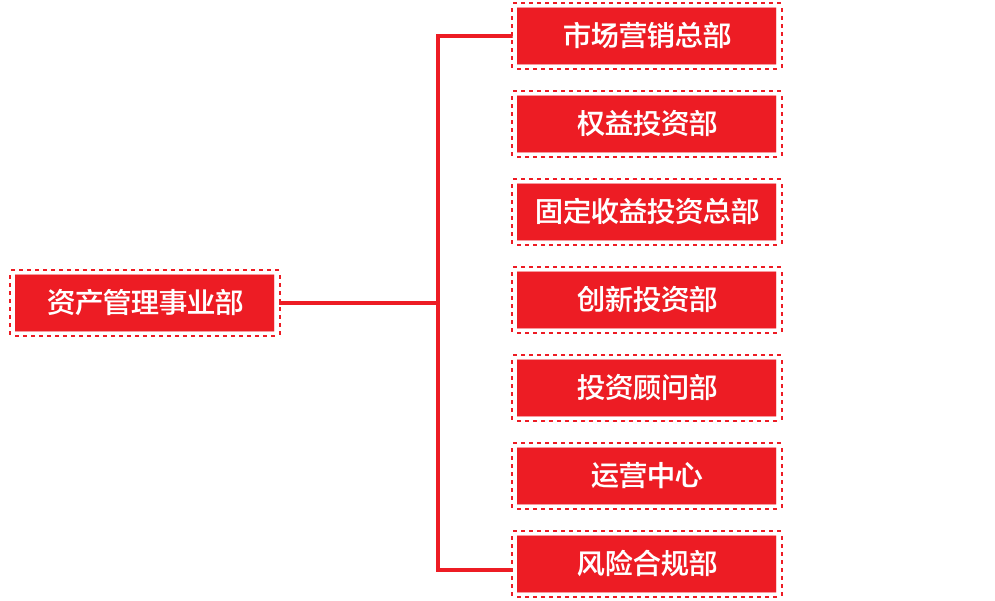 w66资产管理事业部下设七个部门:市场营销总部、权益投资部、固定收益投资总部、创新投资部、投资顾问部、运营中心、风险合规部。